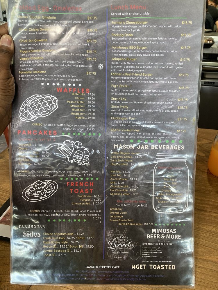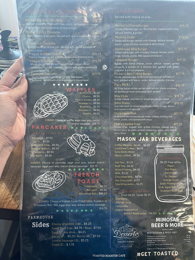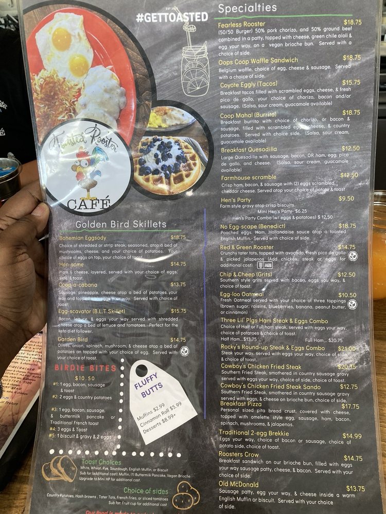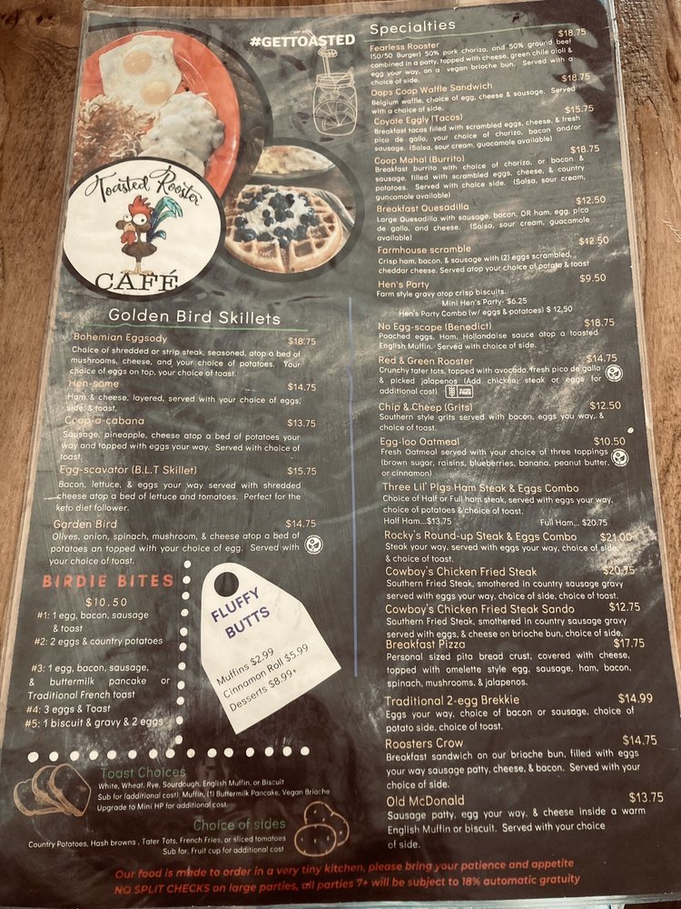 Toasted Rooster Cafe, located in Sacramento, offers a diverse menu featuring burgers, cocktails, and breakfast/brunch options. With vegan and vegetarian choices, wheelchair accessibility, and various payment options including cryptocurrency, it caters to a wide range of diners. The Chef's Special, Biscuit Brigade, is a crowd favorite, showcasing a delicious blend of sausage, cheese, egg, and country gravy on a crisp biscuit. Customer reviews highlight the warm, welcoming atmosphere, generous portion sizes, and friendly service. The menu, although extensive, may require some patience due to the small kitchen, but the flavor-packed dishes make it worth the wait. Overall, Toasted Rooster Cafe is a hidden gem in the Arden area, offering a delightful dining experience for breakfast or brunch enthusiasts.